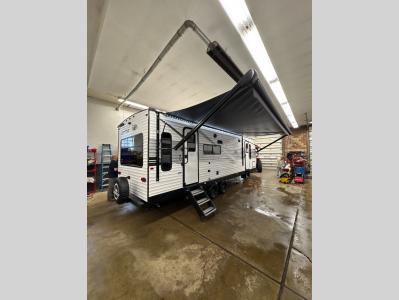 You can comfortably sleep up to six people in this trailer thanks to the RV queen bed in the front bedroom, plus the booth dinette and jack-knife sofa in the main living area! The chef of your crew will have a three burner cooktop and microwave oven to prepare meals, and everyone can store their favorite drinks in the 8 cu. ft. 12V refrigerator. The walk-through bath is spacious and includes a radius shower, toilet, a sink, and linen closet and is the full width of the unit. The outside storage will let you bring along camp chairs and games, fishing poles and more, plus the 18' 3" power awning with LED lights will create a nice place to gather in the evenings!